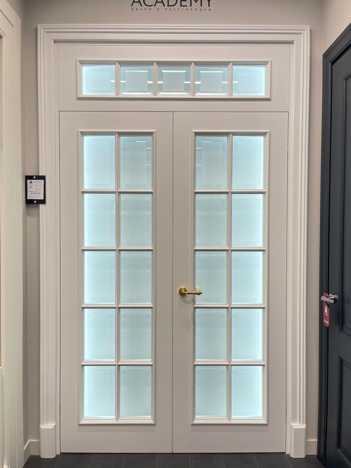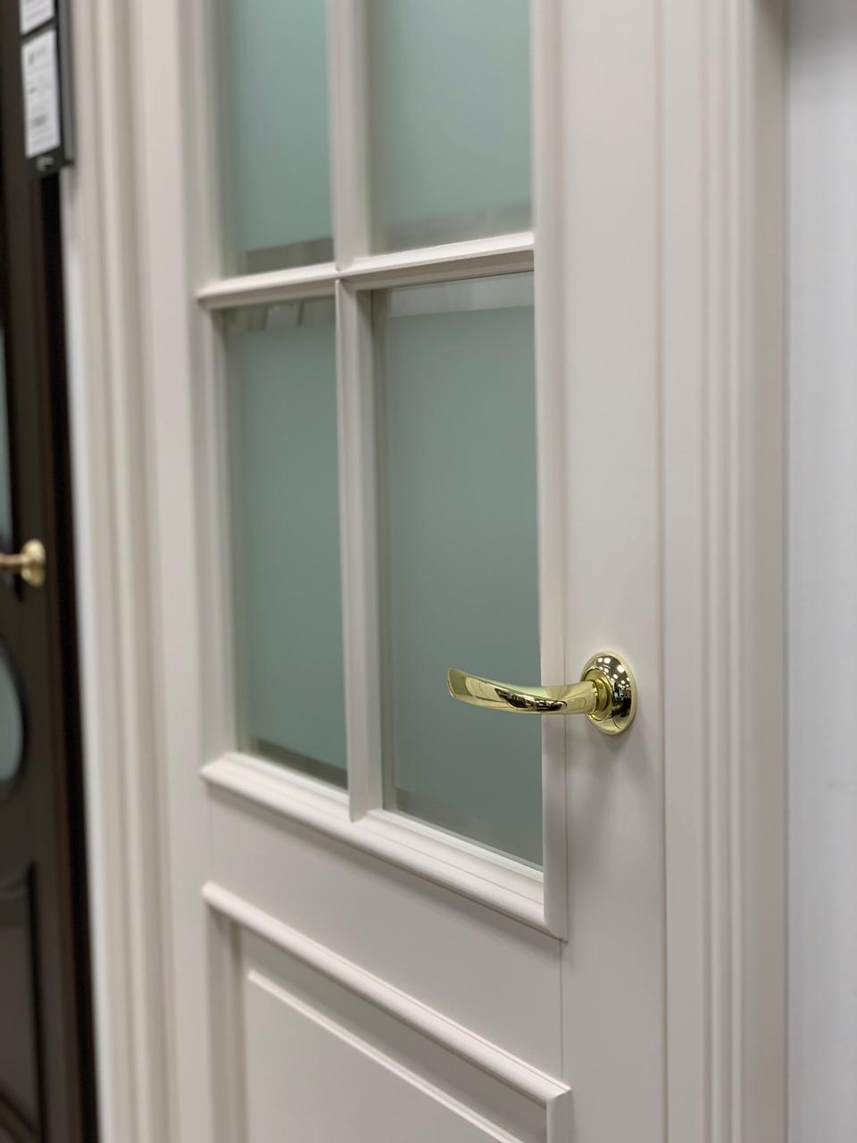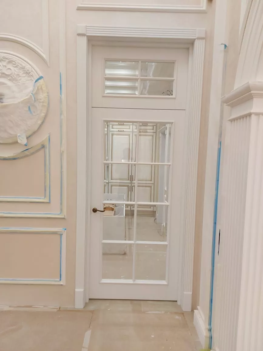 Полотно тамбуратное из инженерного массива (МДФ + ламельный/листельный массив лиственных пород) толщиной 50 мм. с повышенной шумоизоляцией,окра шенное матовыми красками итальянского производства SIRCA с эффектом «soft touch» по шкале RAL с возможностью двусторонней окраски. Объемные филенки, стекла крепятся к полотну с помощью фигурных штапиков (багетов).