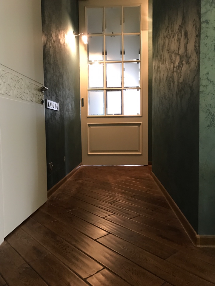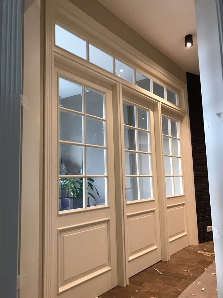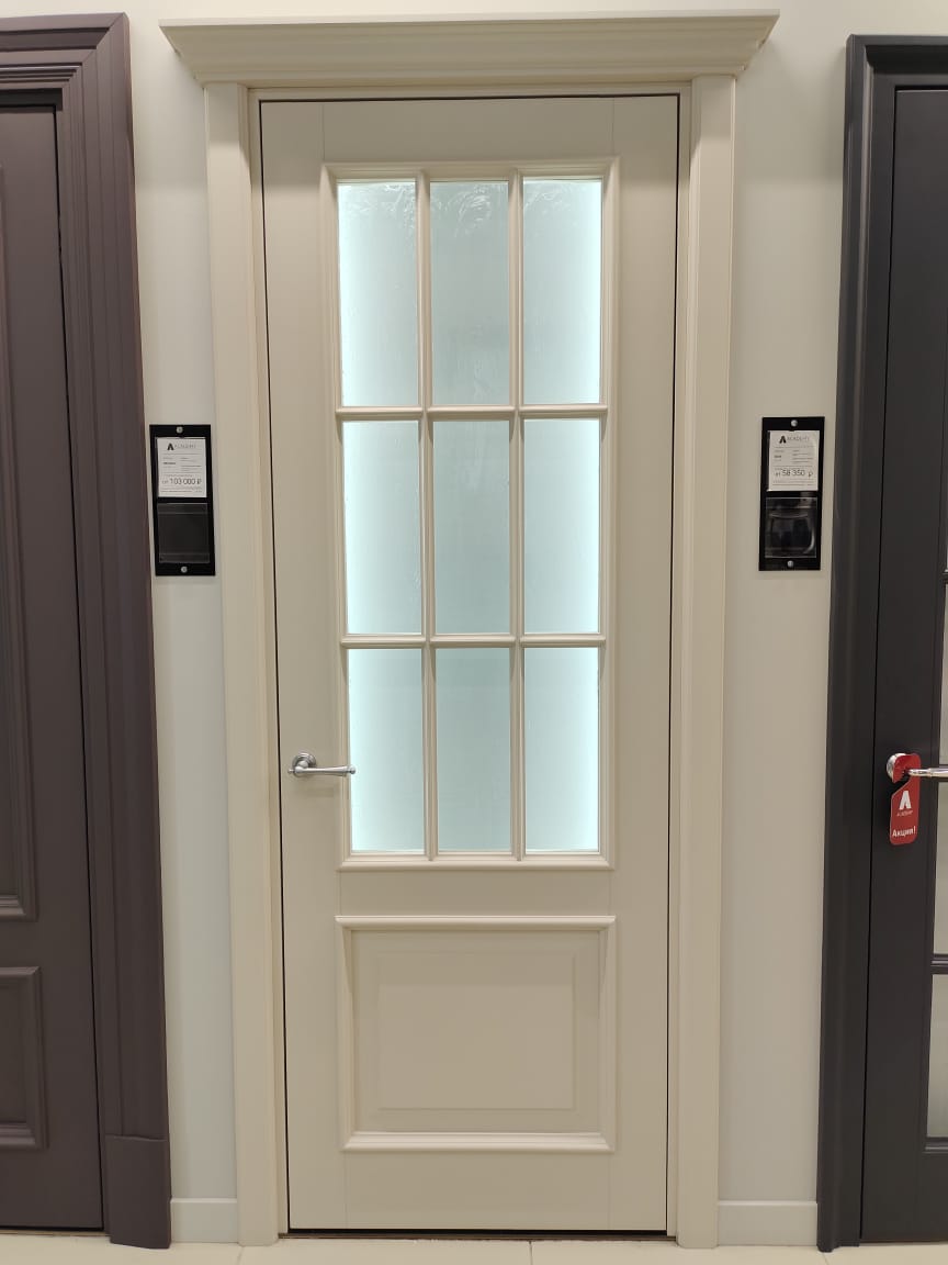 Полотно тамбуратное из инженерного массива (МДФ + ламельный/листельный массив лиственных пород) толщиной 50 мм. с повышенной шумоизоляцией,окра шенное матовыми красками итальянского производства SIRCA с эффектом «soft touch» по шкале RAL с возможностью двусторонней окраски. Объемные филенки, стекла крепятся к полотну с помощью фигурных штапиков (багетов).