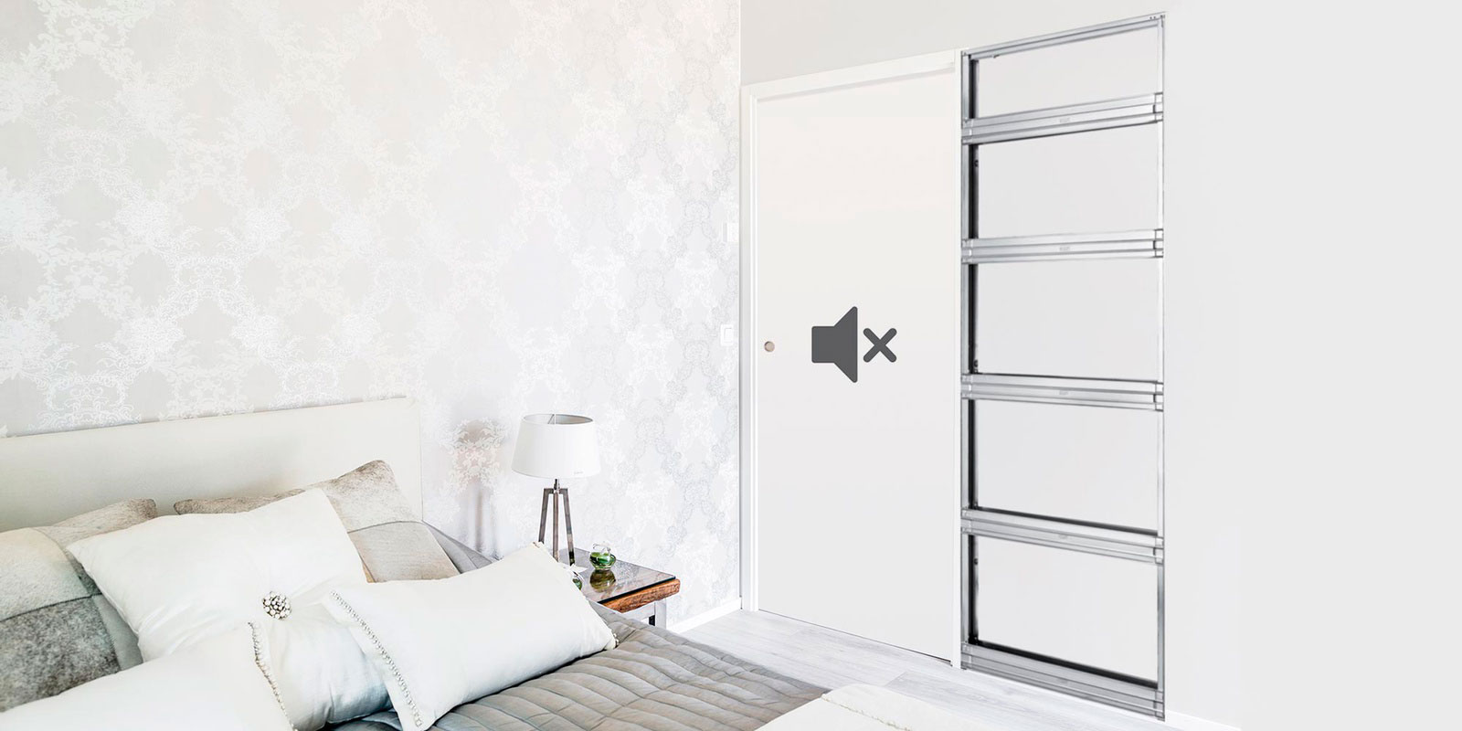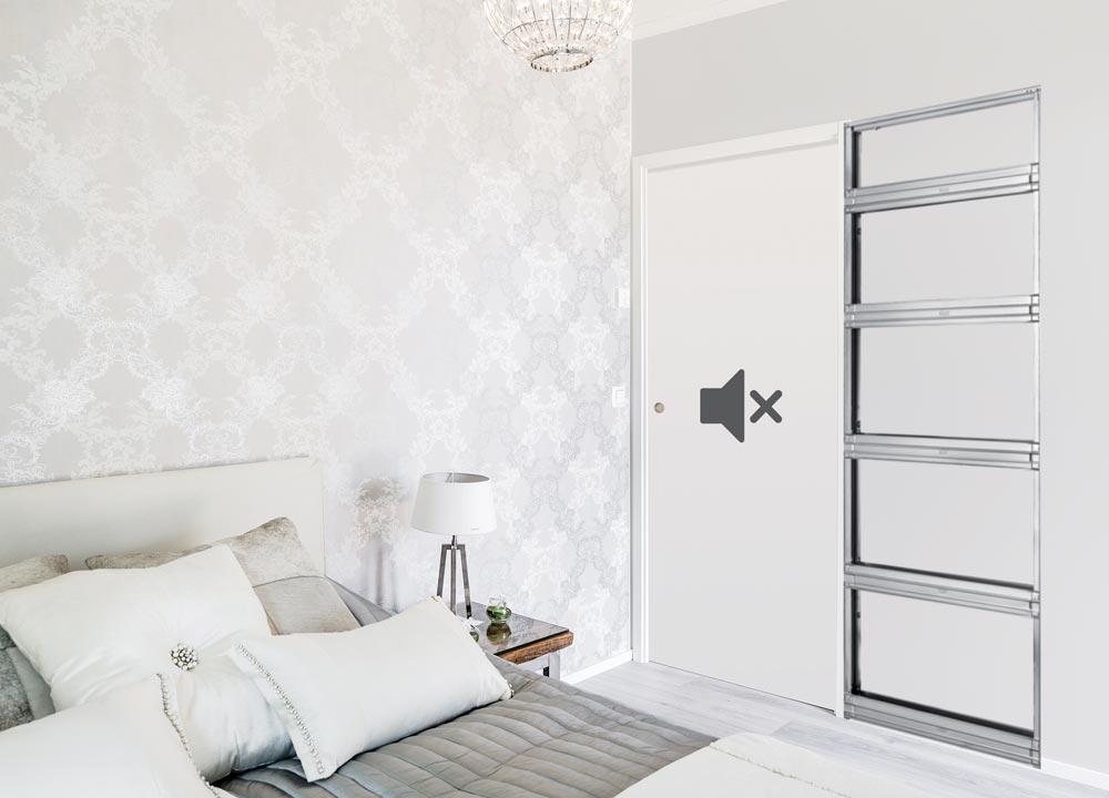 Все компоненты, обеспечивающие звукоизоляцию раздвижной двери в пенал, предназначены для удержания шума. Настоящая система состоит из: