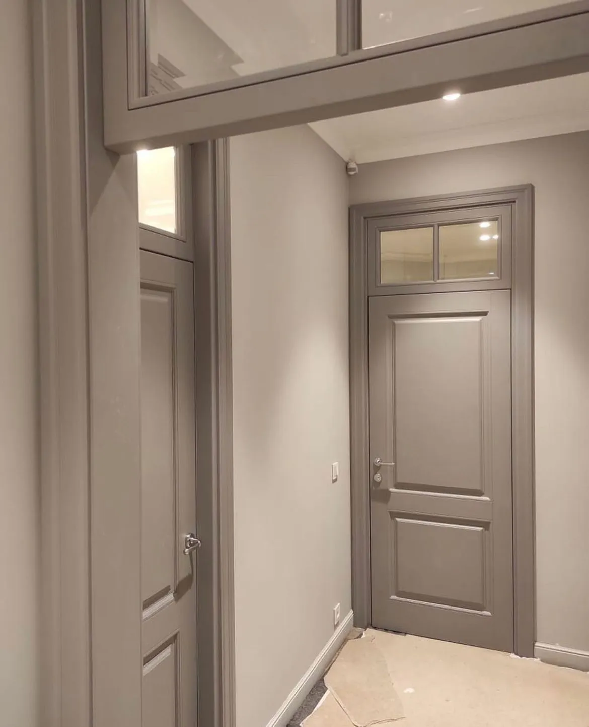 • Современный стиль: Полотна на компланарном коробе (плоскость наличника совпадает с плоскостью полотна) или скрытом коробе (без декоративного наличника) с трендовыми фрезеровками или небольшими стеклянными вставками.