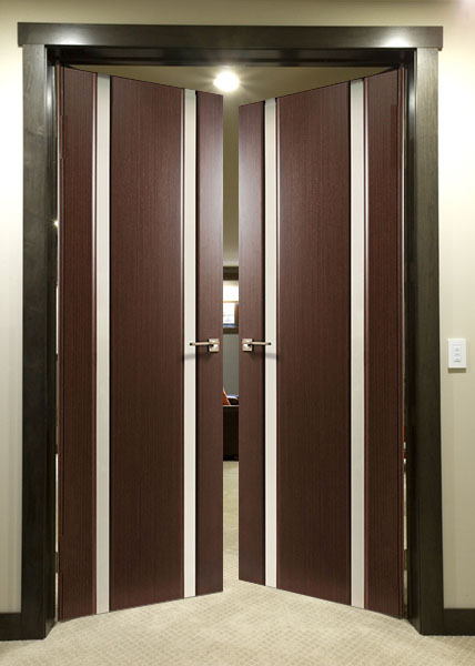 • многообразие. Светопрозрачные поверхности в составе дверей с узким стеклом превосходно сочетаются и с древесиной, и с алюминием. Их можно по-разному декорировать, превращая в гармоничные элементы конструкций различных оттенков и направлений дизайна. Лаконичное остекление одинаково выгодно «звучит» в оформлении моделей распашного и раздвижного типа.